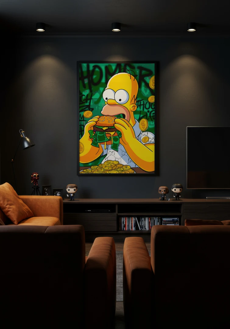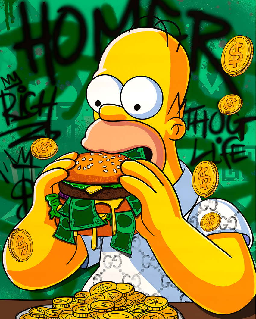 Pop Art „Konsumpcja i Pieniądz” – Nowoczesny Obraz Street Art z Motywem Burgera i Złotych Monet