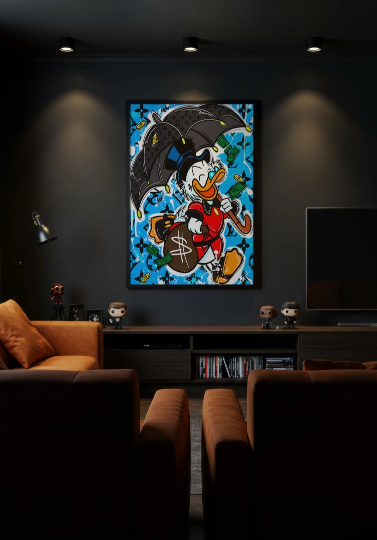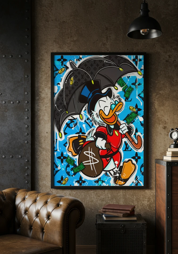 Dynamiczna scena utrzymana w estetyce pop art i street art przedstawia charakterystyczną kaczkę kroczącą z szerokim uśmiechem, trzymającą w jednej ręce elegancki parasol, a w drugiej worek oznaczony symbolem dolara. Wokół niej unoszą się banknoty i monety, tworząc efekt „deszczu pieniędzy”, który nadaje kompozycji lekkości oraz humorystycznego charakteru.