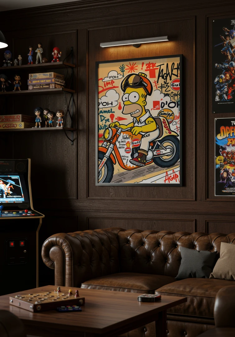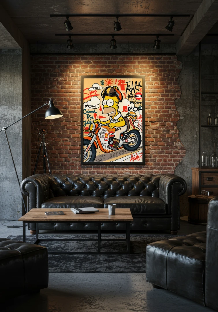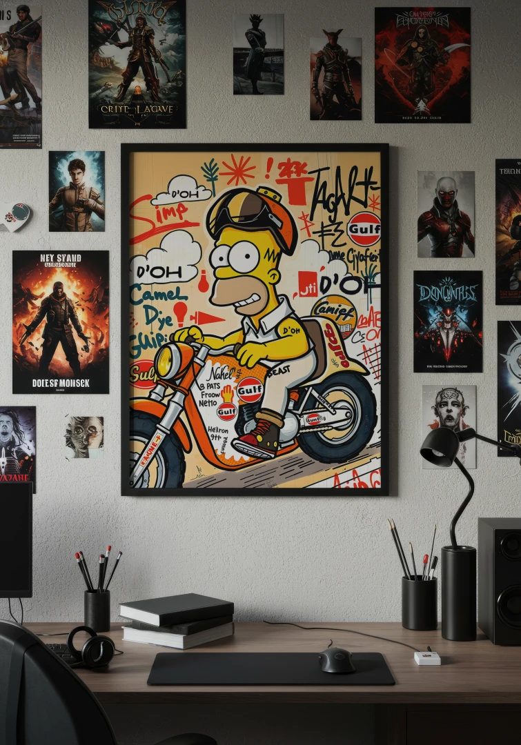 Dynamiczna kompozycja przedstawiająca kreskówkową postać jadącą klasycznym motocyklem w otoczeniu graffiti i motoryzacyjnych akcentów retro. Intensywne kolory, miejskie napisy i klimat vintage tworzą wyrazistą dekorację do garażu, biura, pokoju młodzieżowego lub wnętrza w stylu loft.