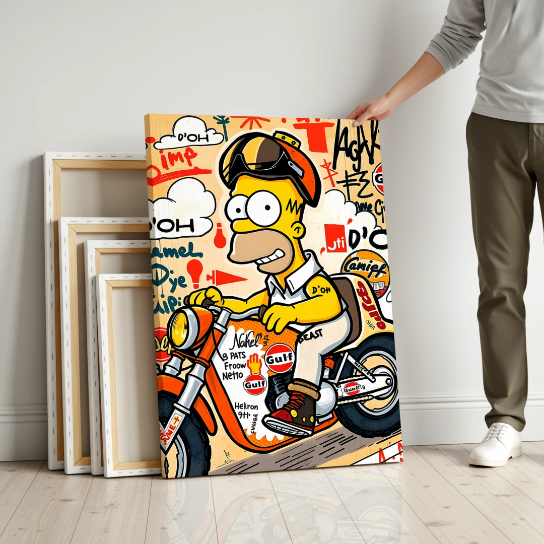 Pełna energii i humoru kompozycja w stylistyce pop art oraz street art przedstawia charakterystyczną, kreskówkową postać w trakcie jazdy klasycznym motocyklem. Bohater ubrany jest w koszulę oraz kask z goglami w stylu retro, co nadaje scenie dynamicznego, motoryzacyjnego klimatu inspirowanego kulturą custom i vintage.